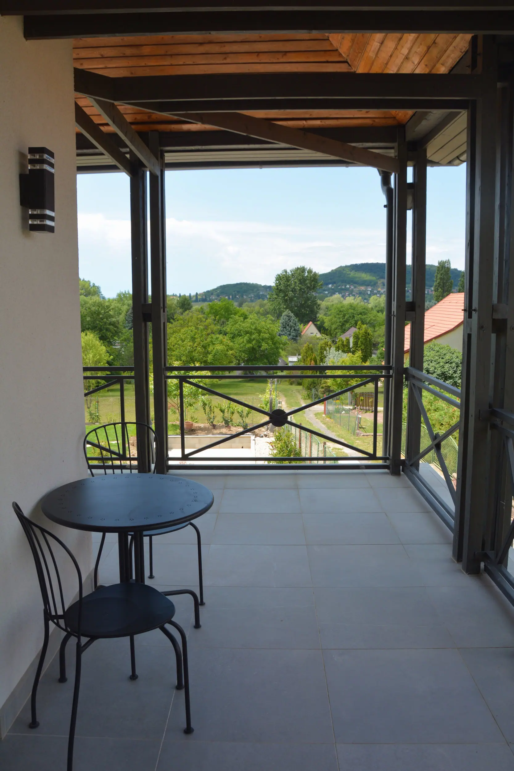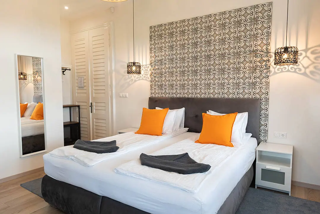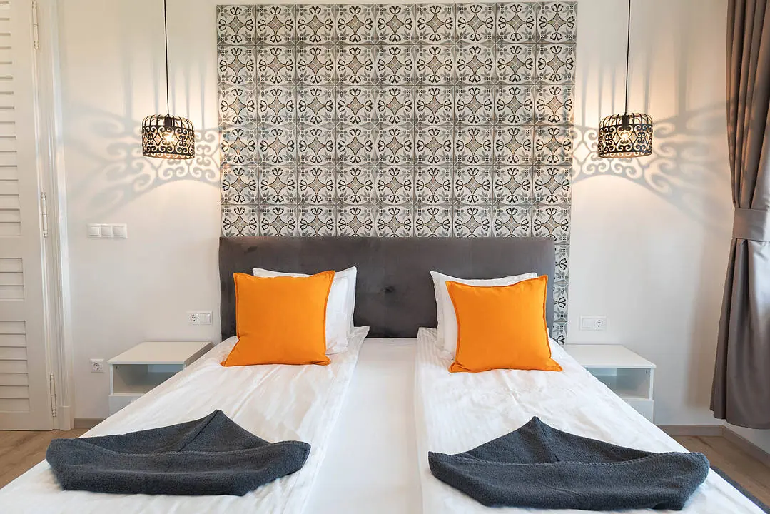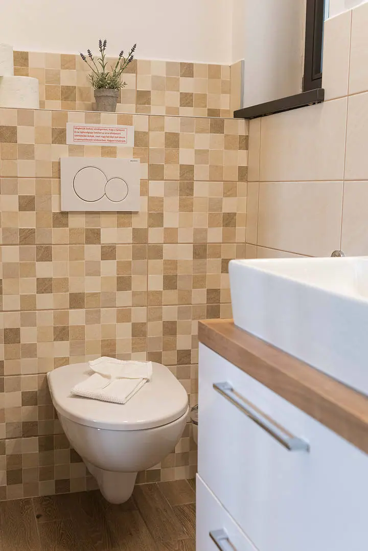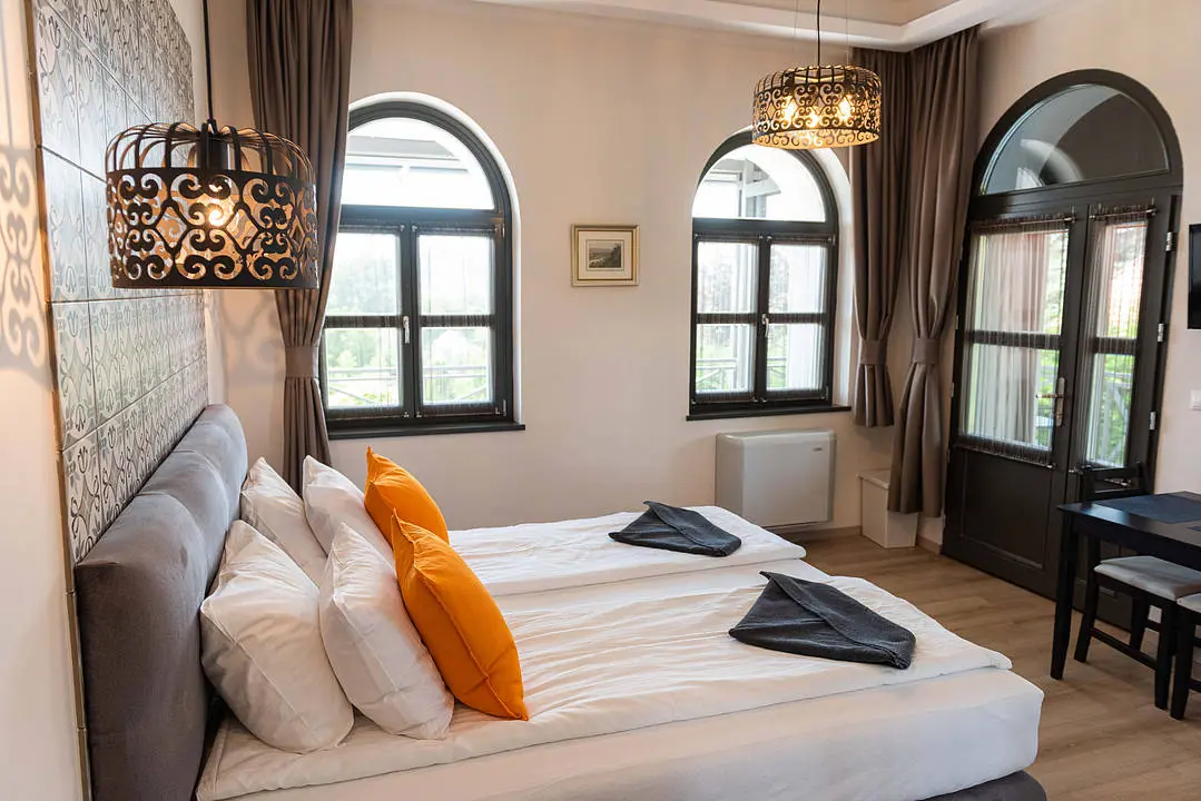 2 fős, 1 kétágyas szoba, saját zuhanyzós fürdőszobával, hajszárítóval, hűtővel, vízforralóval, terasszal